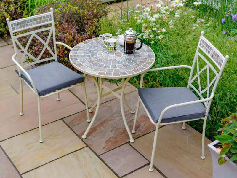 MESAS DE TERRAZA GRANDES CON SILLONES EN MOSAICO Y FORJA